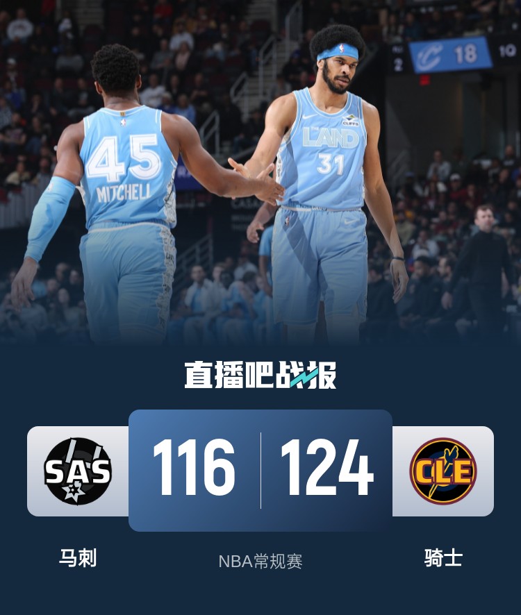 比赛开始,马刺上来反客为主轰出8-0,但骑士迅速回应11-3追平比分,随后双方连续对攻,骑士外线连续3记三分首节领先6分,次节双方继续拉锯战,米切尔还是接连送助攻加里突外投带队11-0拉开双位数领先,但马刺连续三分回应8-0止血,半场骑士领先5分。下半场,双方展开拉锯战,巴恩斯反击上篮2+1一度反超比分,加兰三分止血回应,三节骑士还是保持3分领先,末节TT二级恶意犯规直接被驱逐,双方比分持续胶着,阿伦连续内线打成助骑士9-0重新取得7分领先,瓦塞尔连续三分继续咬住,加兰三分加上篮杀死比赛,最终骑士124-116力克马刺,拿到3连胜。