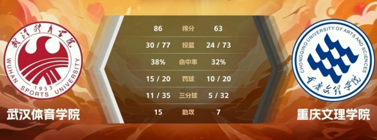末节比赛,重庆文理的进攻再次陷入麻烦,本节初段拿到六分后便陷入到漫长的得分荒,武汉体院再次将分差扩大到二十分以上,比赛彻底失去悬念,最终武汉体院86-63大胜重庆文理进入八强。