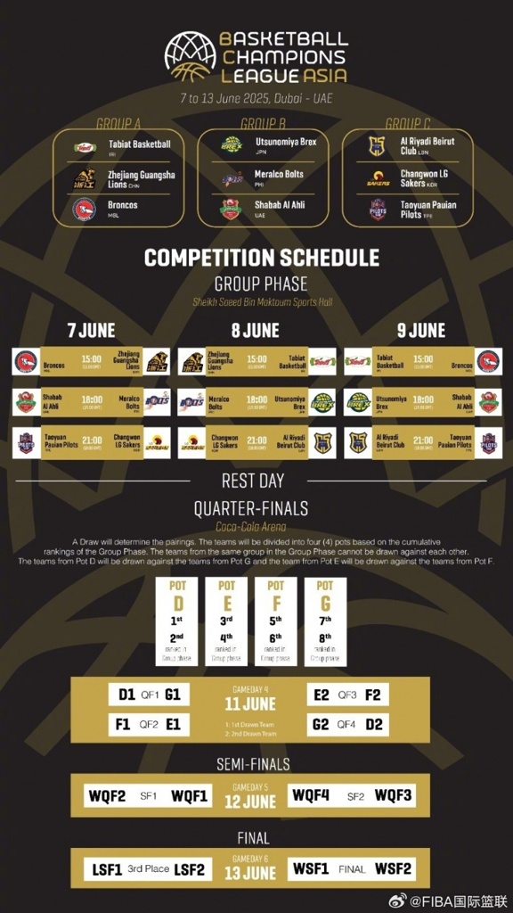 篮球亚冠详细赛程出炉:广厦6月7日与8日19点出战小组赛