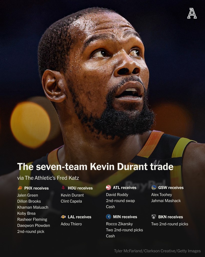 七队交易细节!Shams:火箭得KD+卡皇 太阳收5人 湖人拿36号秀