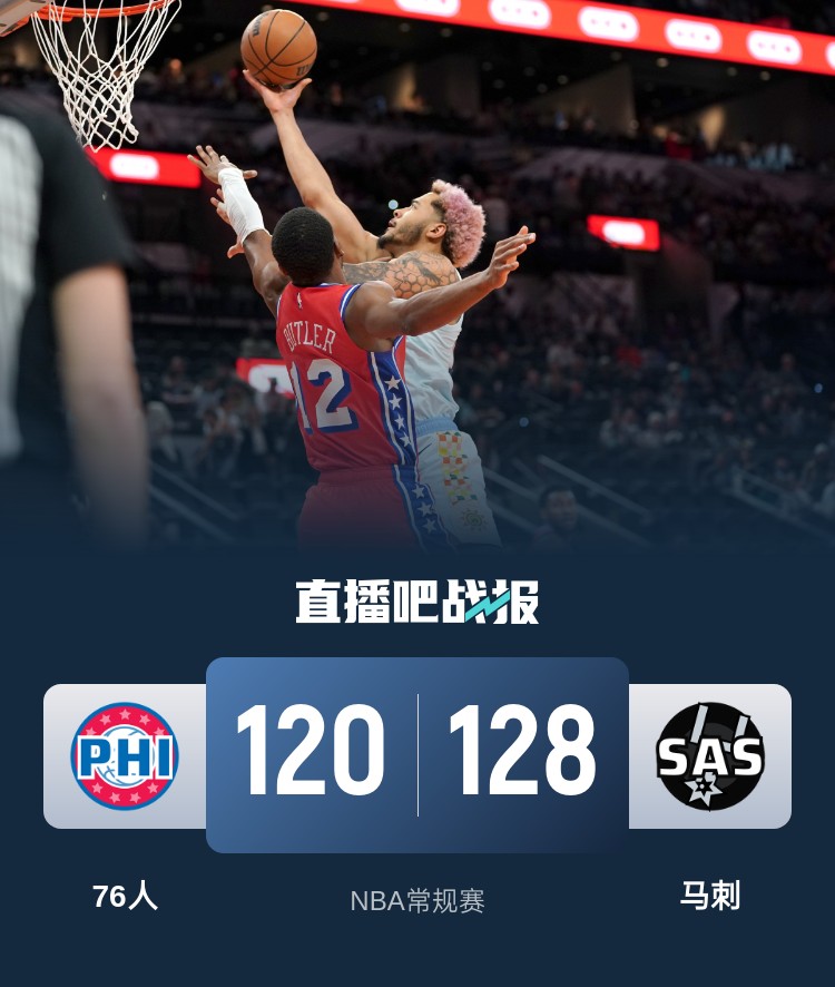 比赛开始后76人率先打出攻势取得领先,马刺随后追上比分并完成反超。第二节马刺延续手感外线一阵三分雨将分差拉大到两位数,格莱姆斯和亚布塞莱努力追分,但场上分差一直保持在两位数。易边再战,马刺刚上来依旧火力凶猛频频拿分,但格莱姆斯突然爆发,他凭借一己之力打出12-1的攻势帮助76人追上比分,此后马刺进攻受阻,76人继续发起反扑依据将比分反超,最后一节马刺外线再度找到手感,76人则是通过冲击内线拿分,最后阶段马刺通过反击再度打出10-0的攻势夺回领先,最终马刺128-120送给76人3连败。