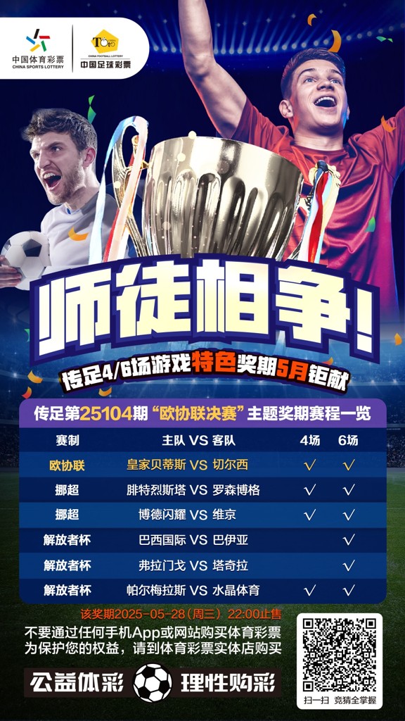 第25104期传足4/6场游戏特色奖期已经于2025年5月25日20:00开售,将于2025年5月28日22:00停售,并于5月29日开奖,其中皇家贝蒂斯VS切尔西、腓特烈斯塔VS罗森博格、博德闪耀VS维京、帕尔梅拉斯VS水晶体育为4场进球游戏竞猜赛事。