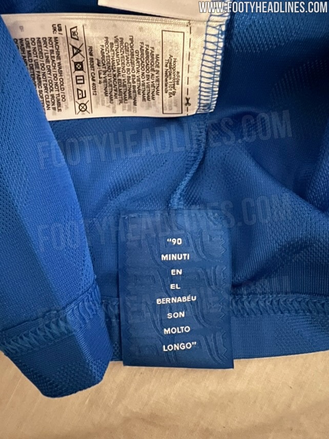 据悉,球衣设计灵感源自伯纳乌球场的新座椅,并且内侧印有“90 Minuti en el Bernabéu son molto longo(伯纳乌的90分钟非常漫长)”,这是圣地亚哥伯纳乌看台上的著名口号,源自华尼托在1984/85赛季欧洲联盟杯半决赛期间所说的话。