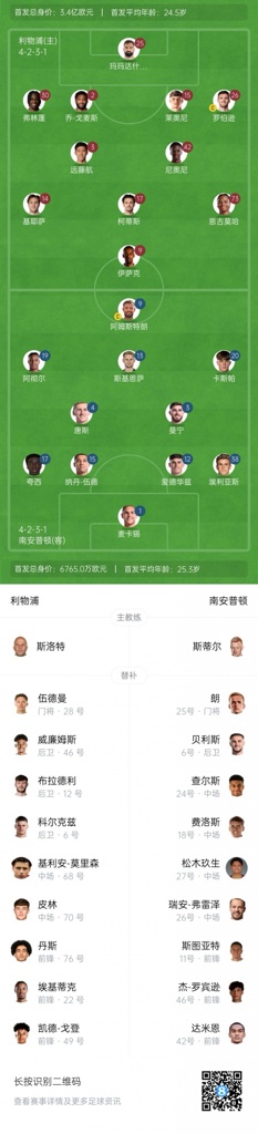 利物浦替补:28-伍德曼、6-科尔克兹、12-布拉德利、46-里斯-威廉姆斯、68-基利安·莫里森、70-托米·皮林、22-埃基蒂克、49-凯德·戈登、76-杰登·丹斯