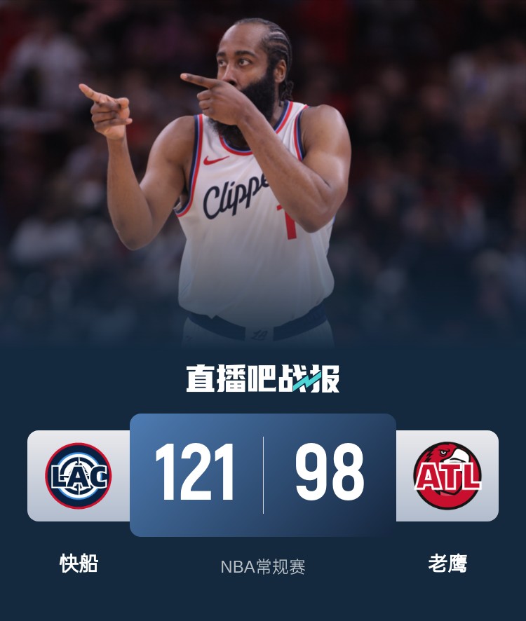 哈登25+8+7 小卡25+6+5断 杨18中6+7失误 快船终结老鹰4连胜