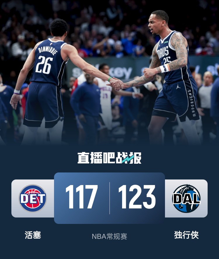 丁威迪31+7 华盛顿27分 CC35+7+6 独行侠击退活塞止4连败