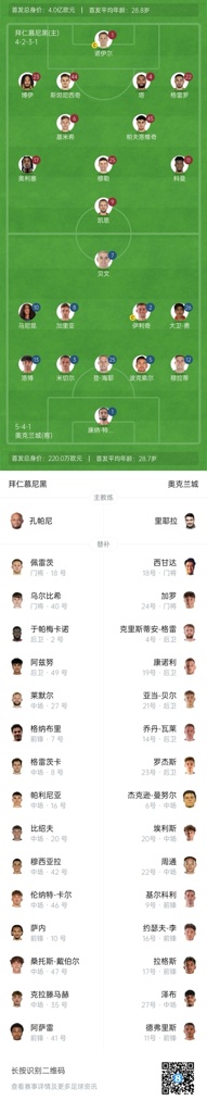 拜仁首发:1-诺伊尔、4-塔、22-格雷罗、23-博伊、44-斯坦尼西奇、6-基米希、45-帕夫洛维奇、9-凯恩、11-科曼、17-奥利塞、25-穆勒