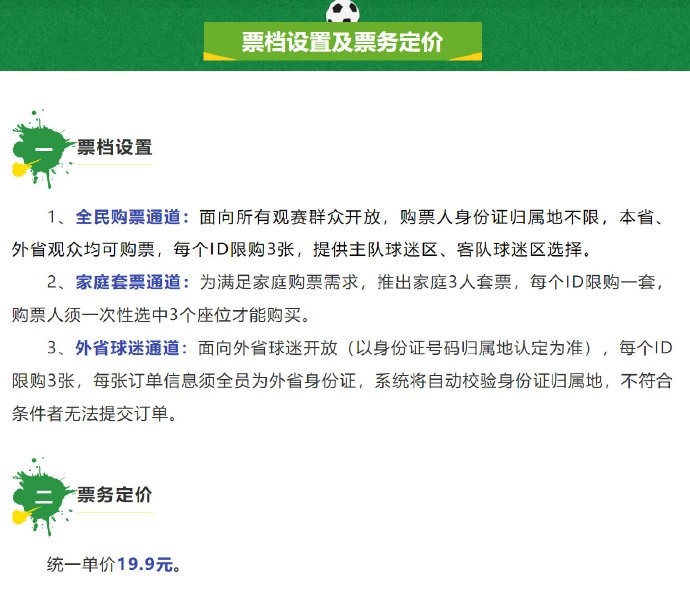 1、全民购票通道:面向所有观赛群众开放,购票人身份证归属地不限,本省、外省观众均可购票,每个ID限购3张,提供主队球迷区、客队球迷区选择。