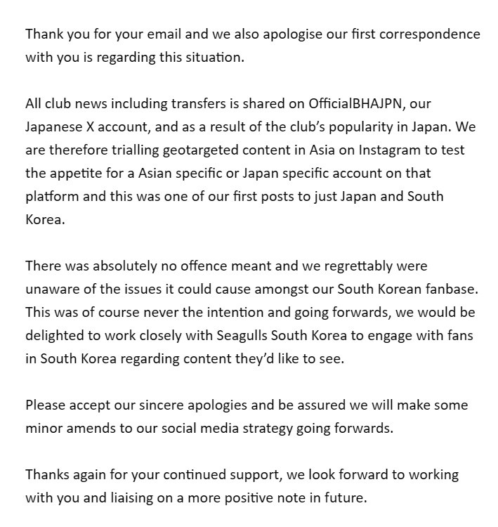 布莱顿韩国球迷组织致信俱乐部,对用日语官宣尹棹泳外租表示不满,俱乐部回复邮件表达歉意:“感谢您的邮件,我们对此深表歉意。这是我们首次就此事与您联系。所有俱乐部新闻,包括转会信息,均会通过我们的日本X账号OfficialBHAJPN发布。由于俱乐部在日本的受欢迎程度,我们正在Instagram上测试针对亚洲地区的地理定位内容,以评估该平台上是否存在对亚洲专属或日本专属账号的需求,此次推文正是我们首次针对日本和韩国发布的测试内容。