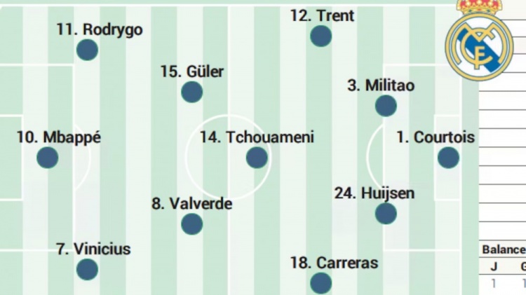 综上所述,皇马客战皇家社会预计首发阵容为:库尔图瓦;阿诺德、米利唐、赫伊森、A费;居勒尔、琼阿梅尼、巴尔韦德;罗德里戈、姆巴佩、维尼修斯