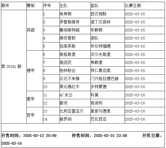 本周末的 传足胜负彩第25041期中不乏焦点:英超,曼城主场对阵布赖顿;德甲,拜仁慕尼黑客场出征柏林;意甲,AC米兰主场迎战科莫;西甲,皇马做客对垒比利亚雷亚尔。